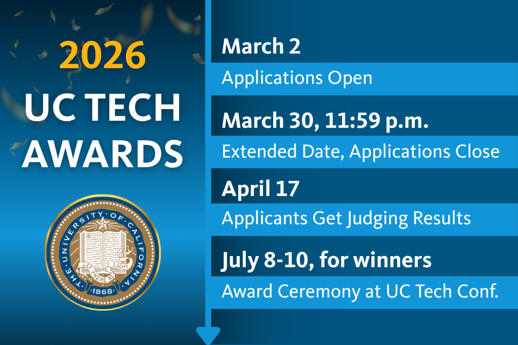Applications and nominations for the 2026 UC Tech Awards Program will be open Monday, March 2nd until Monday, March 30th at 11:59 p.m.
